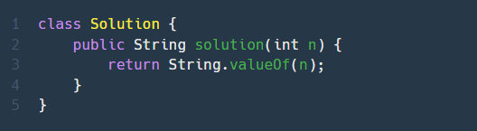 1. 받는 정수 n을 바로 string 타입으로 변환하는 valueOf( ) 함수를 사용하여 바로 return 해준다.