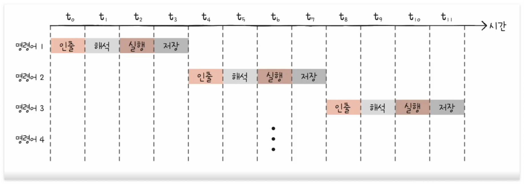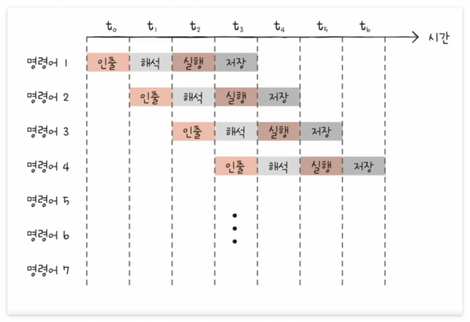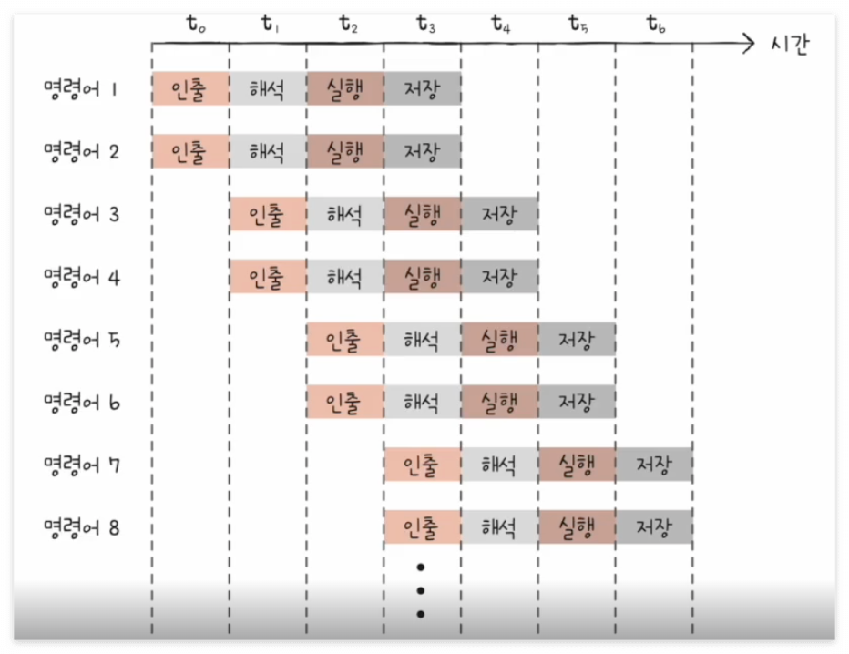 위 그림처럼 명령어를 겹쳐서 수행하면 명령어 하나하나 실행하는 것보다 훨씬 더 효율적으로 처리할 수 있을 것이다.