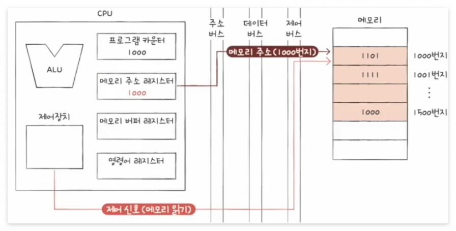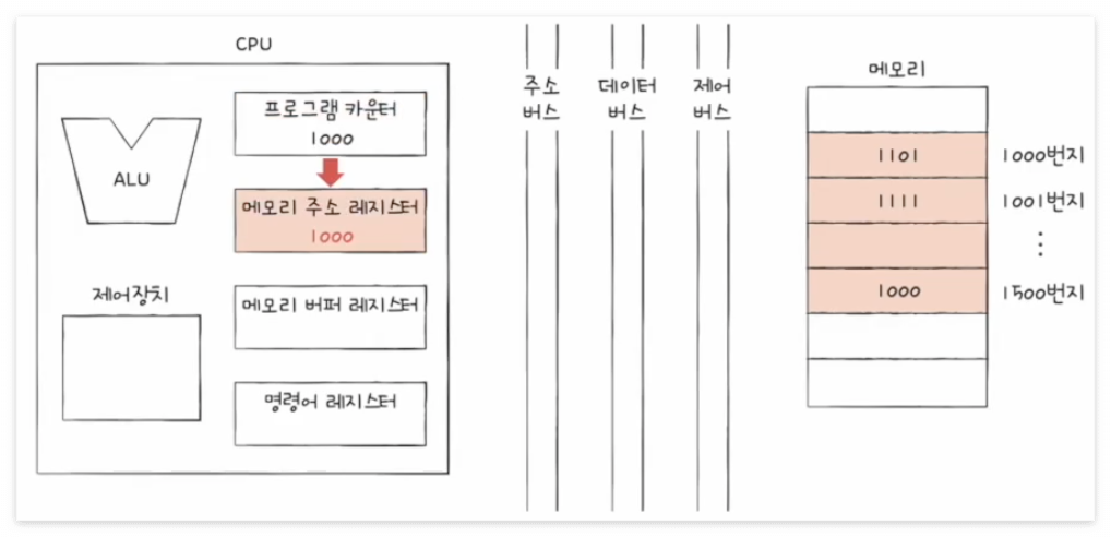 3. 1000번지를 읽어 들이기 위해서는 주소 버스로 1000번지를 내보내야 한다. 이를 위해서는 메모리 주소 레지스터에 1000이 저장된다.