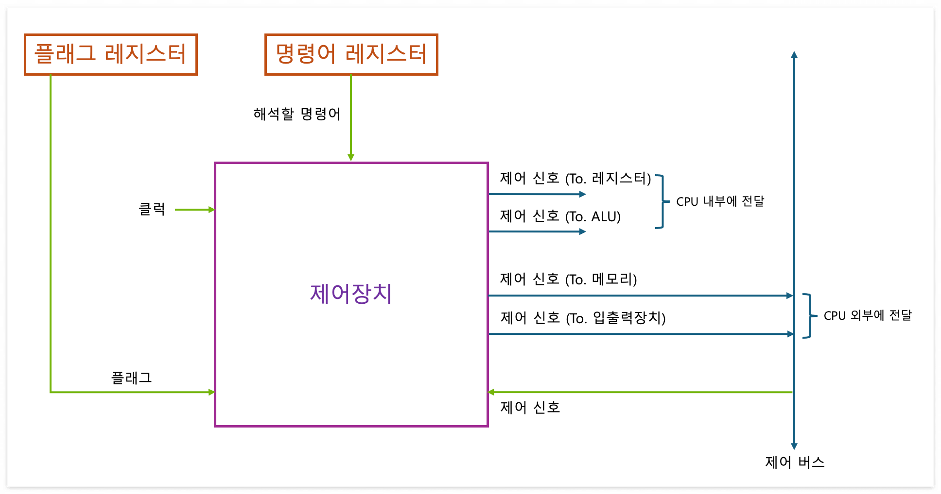 --> 제어 장치는 클럭, 현재 수행할 명령어, 플래그, 제어 신호를 받아들인다.