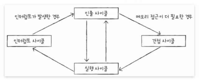 CPU는 흐름을 반복하며 명령어들을 처리해 나가는데, 이렇게 하나의 명령어를 처리하는 정형화된 흐름을 명령어 사이클이라고 한다. 간혹 이 명령어 사이클이 끊기는 상황이 발생할때가있는데 그러한 상황을 인터럽트라고 한다.