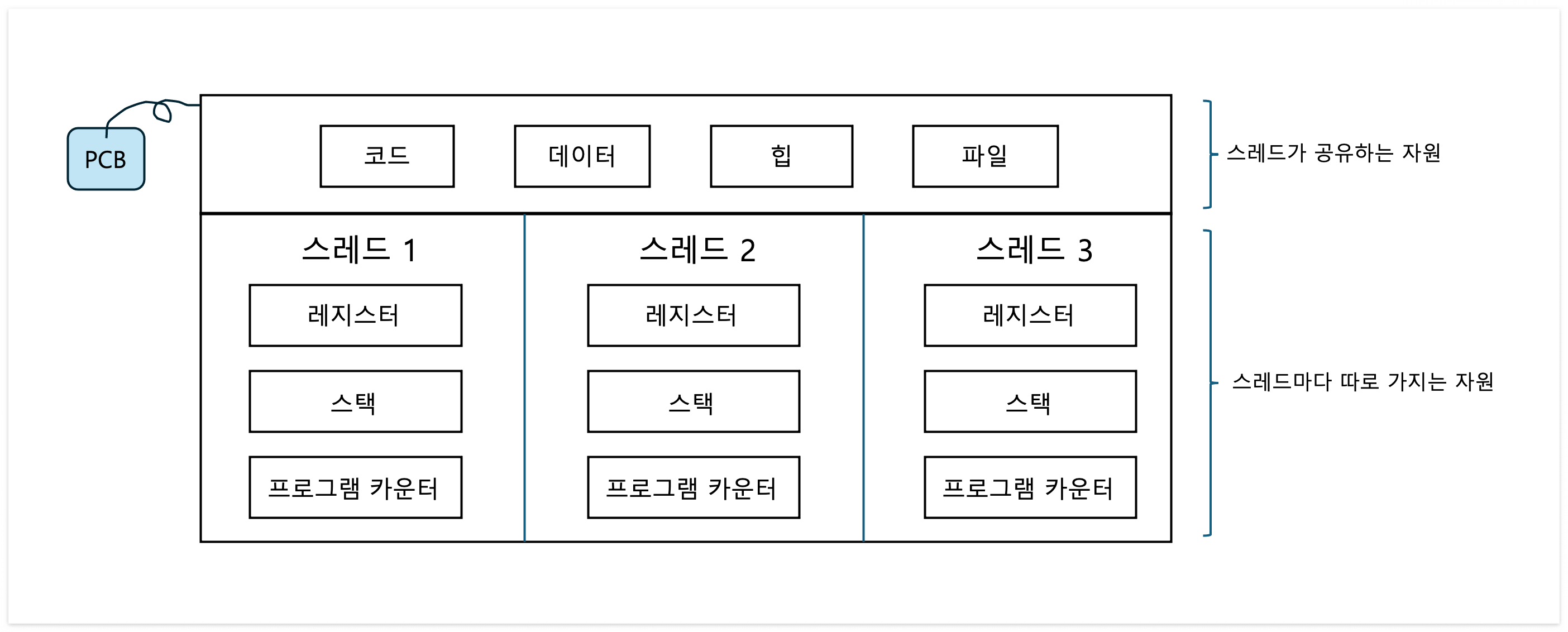 하지만, 멀티스레드로 실행하게 되면 스레드끼리는 같은 프로세스 내의 자원을 공유한다.