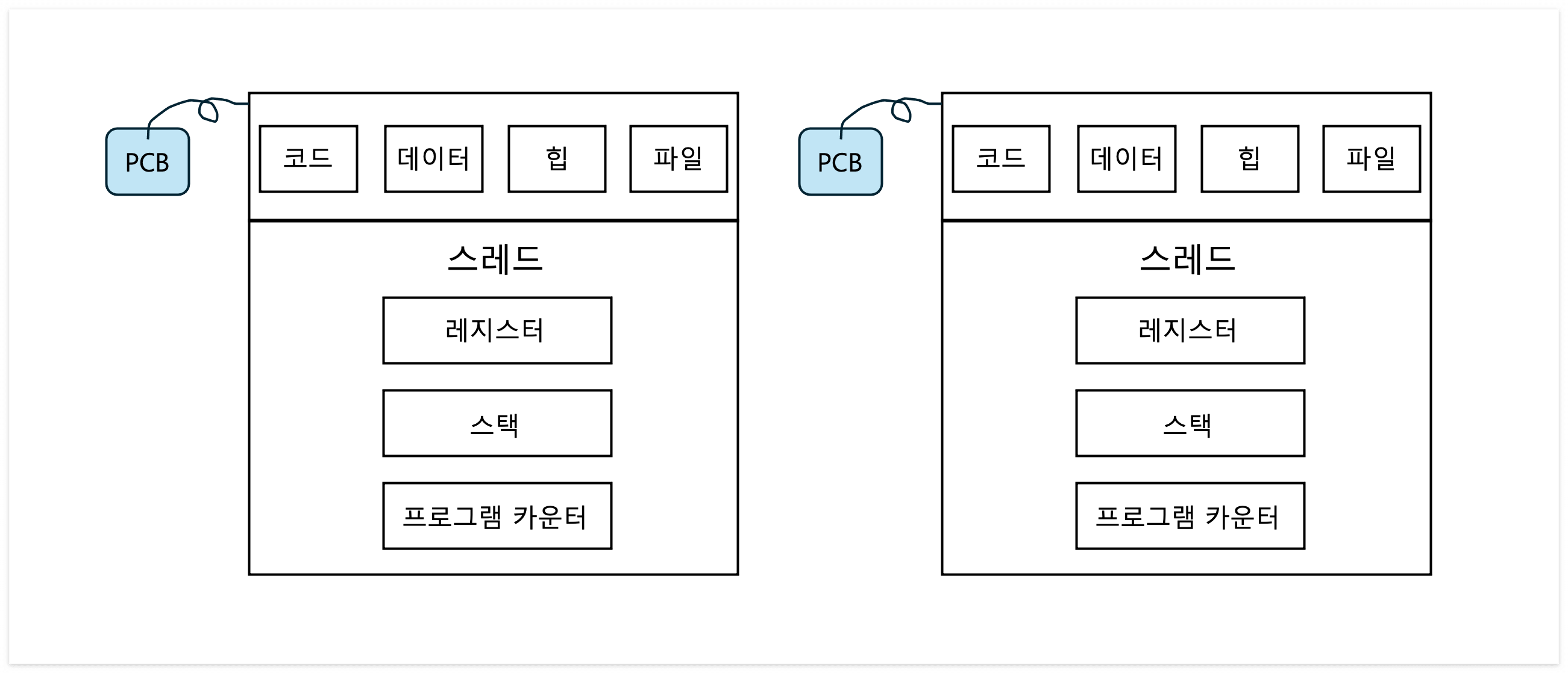 - 프로세스 제어 블록(PCB) : 프로세스를 식별하기 위해 필요한 프로세스와 관련된 정보를 저장하는 자료 구조